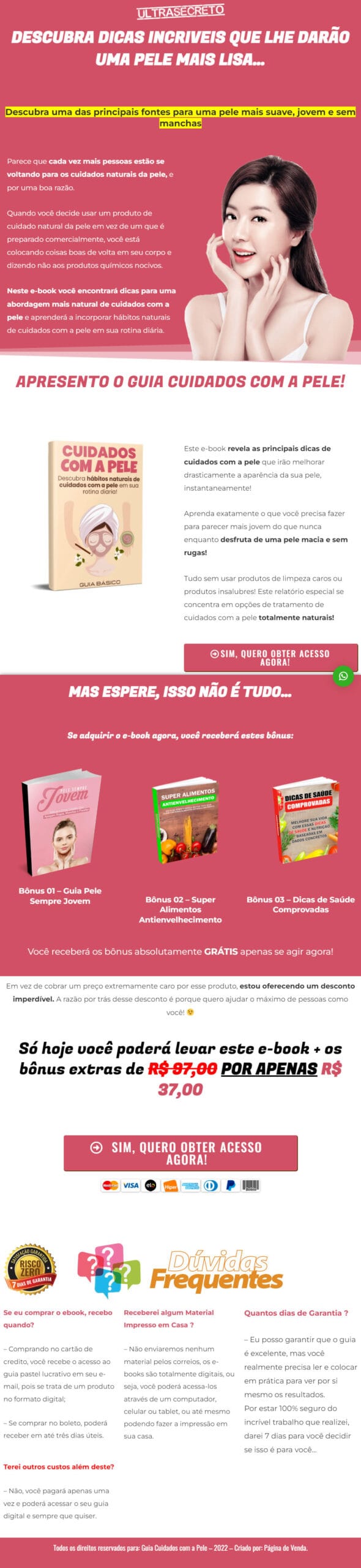 Veja abaixo o que você vai receber adquirindo agora esse Guia Cuidados com a Pele e-Book PLR com Páginas de Vendas: